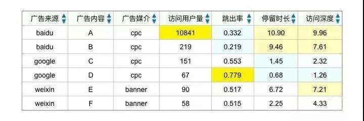 借助 UTM參數(shù),我們對每一次推廣或者投放的廣告進行多維度監(jiān)測(來源、媒介、名稱、內(nèi)容和關(guān)鍵詞),評估不同渠道獲取新客戶的數(shù)量(訪問用戶量、新訪問用戶量)和獲客質(zhì)量(跳出率、停留時間、訪問深度)。