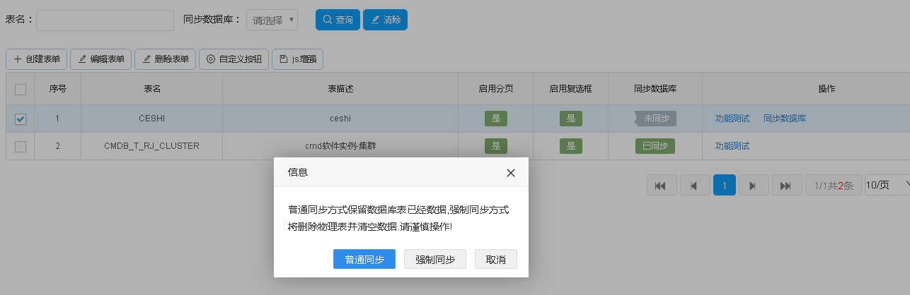 選中需要同步的數(shù)據(jù)庫表,點擊同步數(shù)據(jù)庫按鈕進行同步。系統(tǒng)將提示是 否繼續(xù),且同步方式分為“普通同步”和“強制同步”。普通同步是改動信息較小,SQL 語 句支撐的情況下進行,會將修改表結(jié)構(gòu)同步到數(shù)據(jù)庫;強制同步是會將當(dāng)前數(shù)據(jù)庫表數(shù)據(jù)進 行完全刪除,再重新建立新的數(shù)據(jù)庫表結(jié)構(gòu)。請謹(jǐn)慎選擇“強制同步”,推薦使用普通同步。