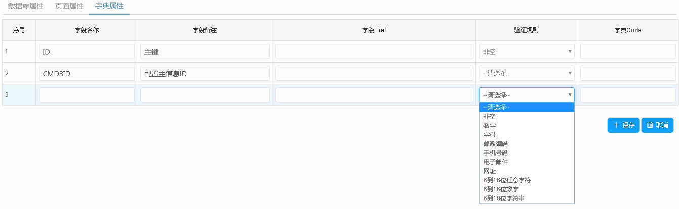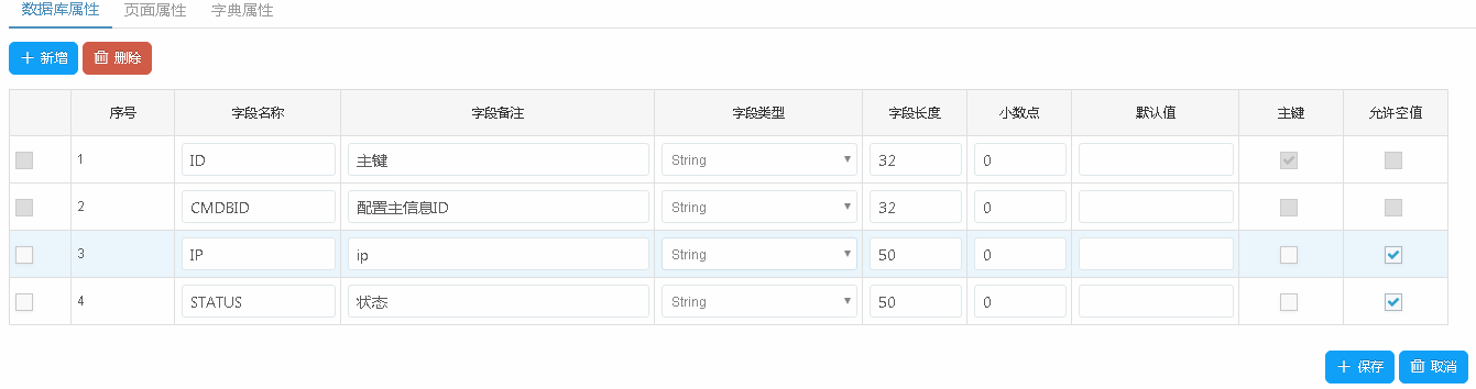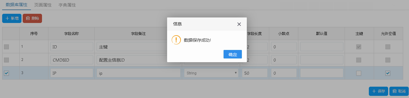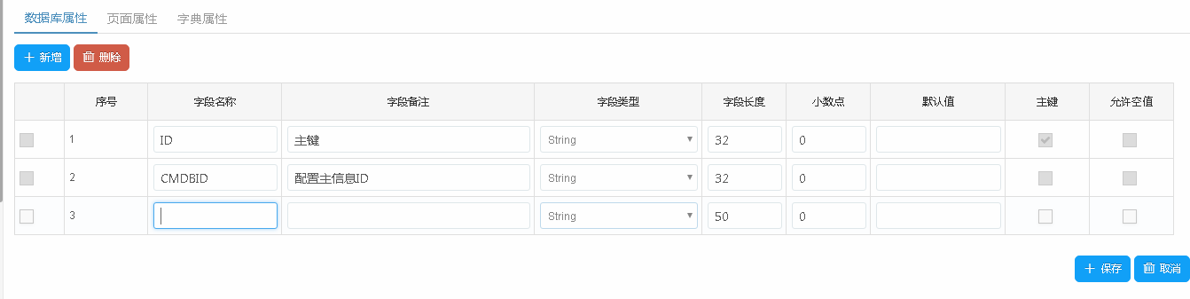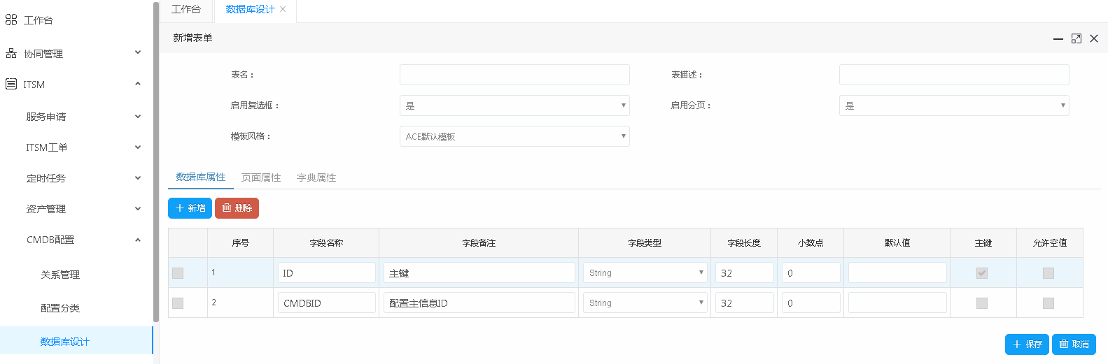 數(shù)據(jù)庫屬性:用于對數(shù)據(jù)庫字典的增刪改,包含字段名稱、備注、類型、字典長度及是否允 許為空關(guān)鍵信息。內(nèi)置 ID、CMDBID 兩個必要的主鍵,這兩主鍵只允許查看,不能編輯刪除。