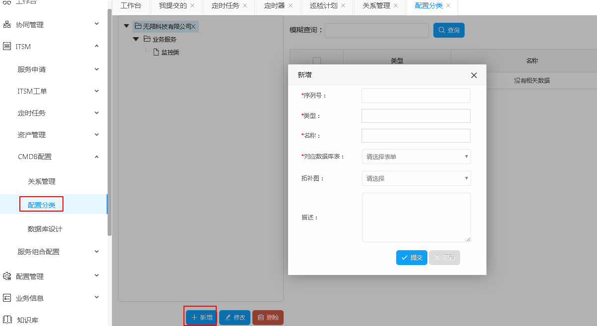 CMDB 中配置分類是用于管理配置分類類別的,另可在配置分類處設(shè)置配置編碼規(guī)則、分類與表的一對一關(guān)聯(lián)、展示拓?fù)鋱D小圖標(biāo)設(shè)置。
