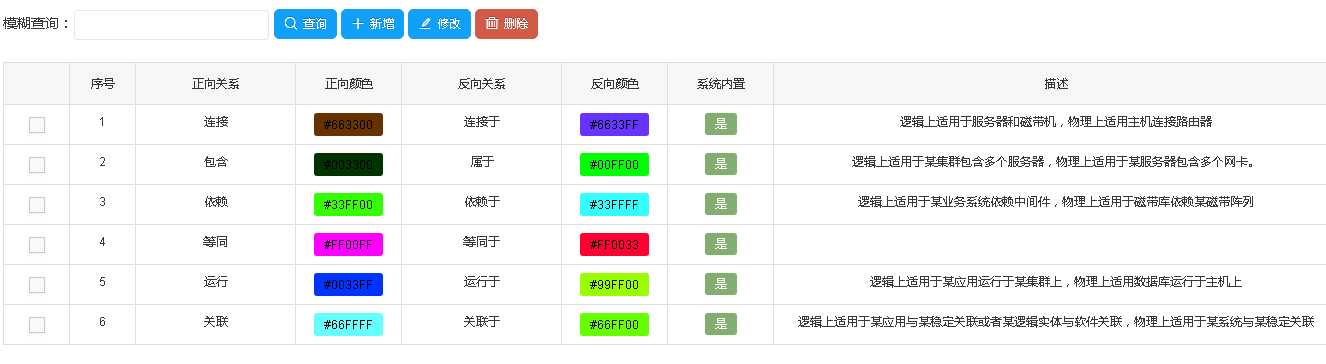 CMDB 中配置配置項關(guān)聯(lián)關(guān)系,含六對關(guān)系以及相應(yīng)的描述,并可對不同關(guān)系設(shè)置不同顏色用于拓?fù)鋱D 線條展示,也可以新增關(guān)系。