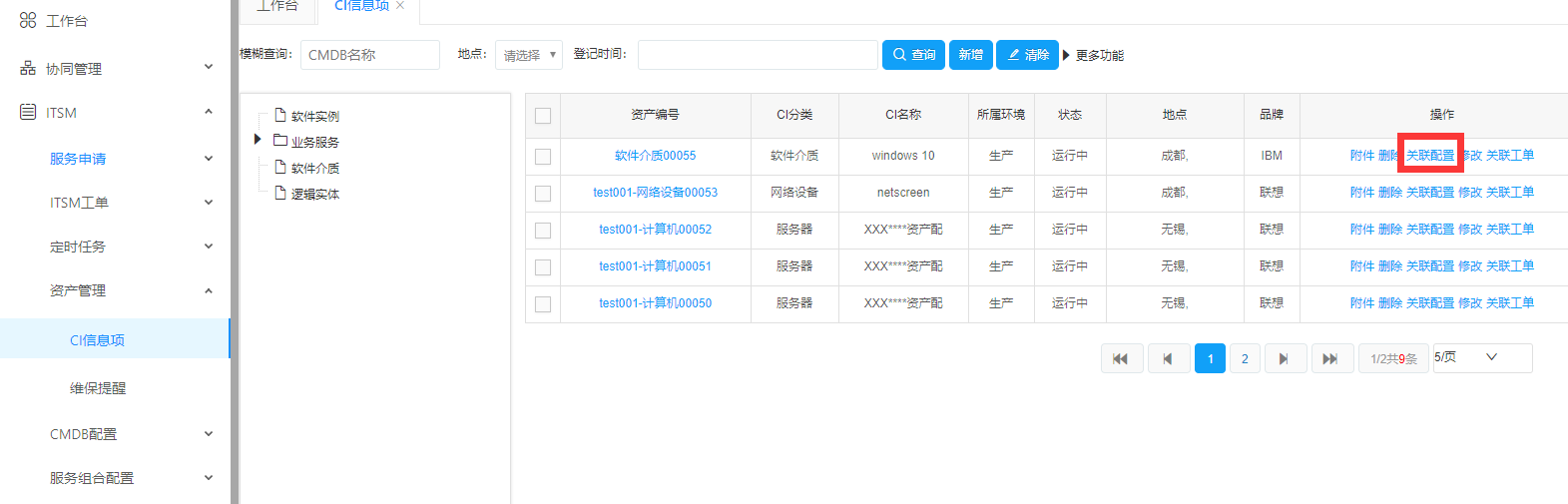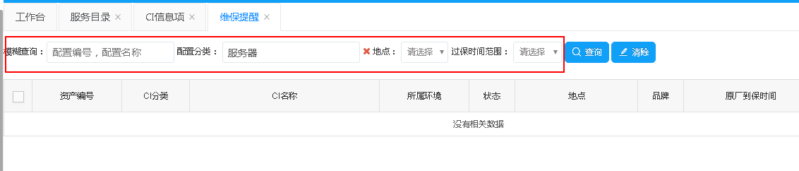 手動輸入模糊查詢,也可以按條件配置分類、地點、過保時間查詢CI項信息,快過保的記錄會提前發(fā)通知給維護人。
