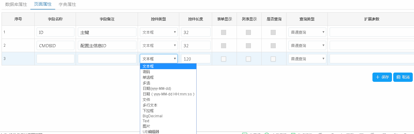 頁面屬性:定義字段信息的控件類型,內(nèi)置有文本框、密碼、單選框、多選、日期、文件、 多行文本、大文本 text、圖片、UE 編輯器,根據(jù)控件長度,可控制控件輸入的長度限制,提 示文本可默認(rèn)展示內(nèi)容。