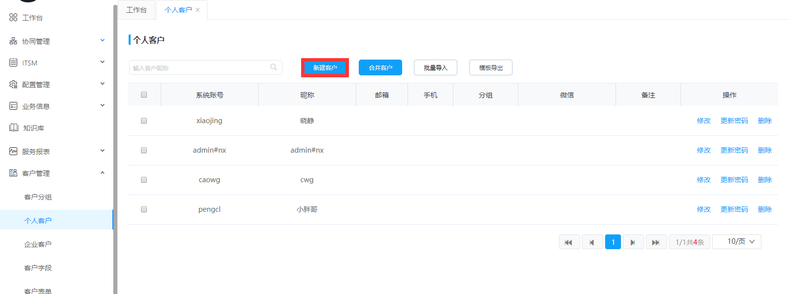 個人客戶主要是對用戶個人的賬號信息的設置管理。可以設置賬號,昵稱,郵箱,手機,分組,微信等,并可以進行修改密碼,移除用戶等操作。