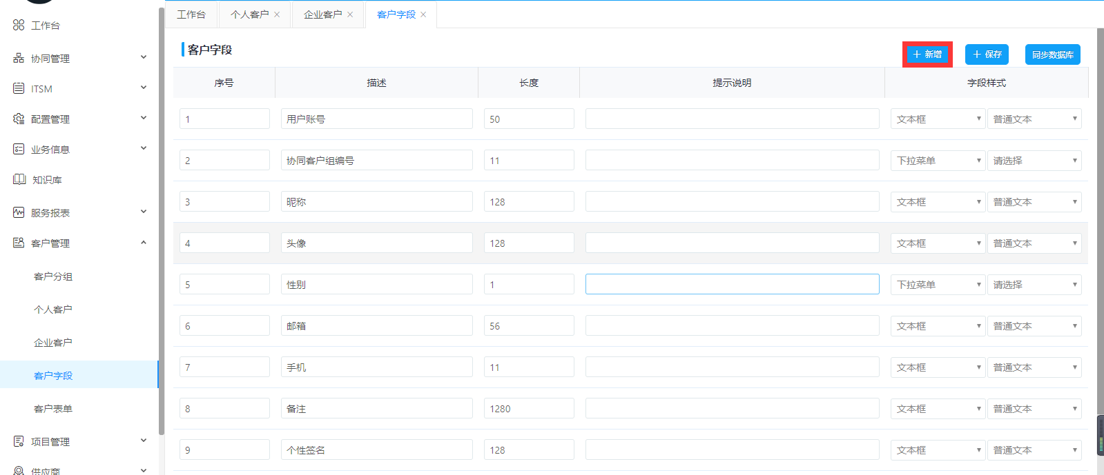 客戶字段主要是對客戶賬號信息的輸入設置字段管理??梢栽O置賬號,昵稱,郵箱,手機,分組,微信等。