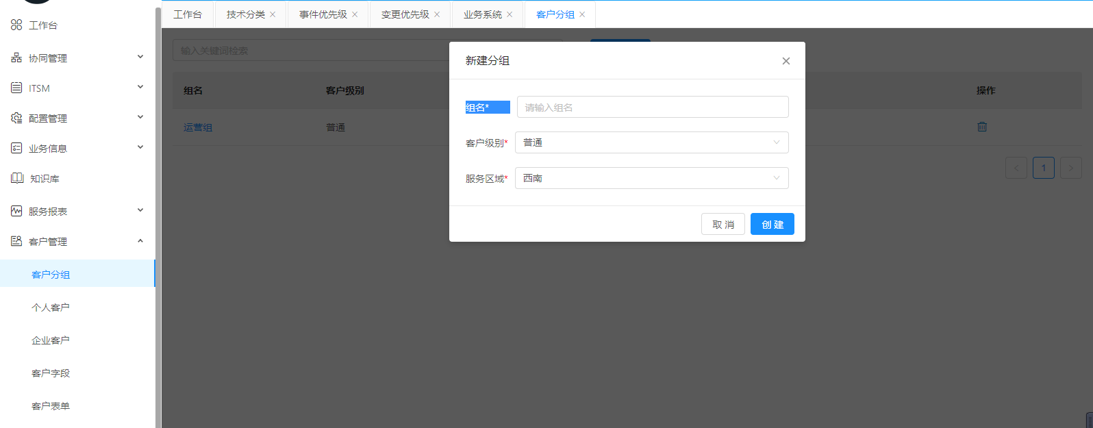 點擊新建分組。彈出對話框,按要求填寫必填項,根據實際需要填寫。如果確認點擊創建,放棄點擊取消
