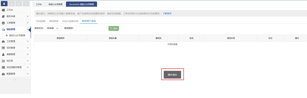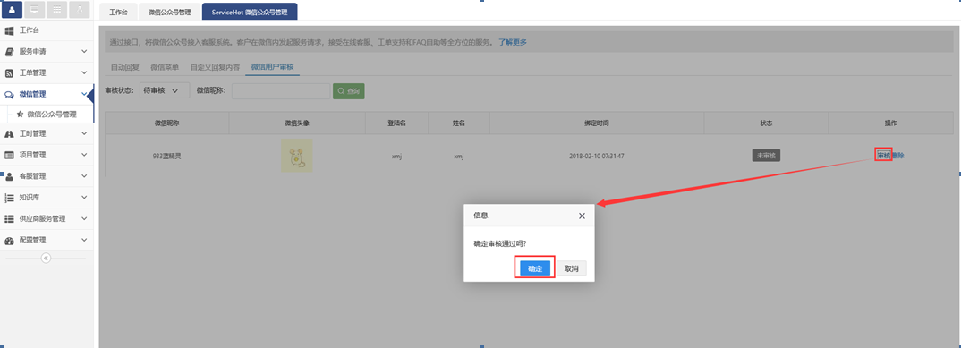 用系統(tǒng)管理員的賬號登錄ServiceHot ITSOM服務(wù)管理系統(tǒng),點擊微信公眾號管理頁面的微信渠道【管理】按鈕,打開ServiceHot微信公眾號管頁面,點擊微信用戶審核這一欄,可以看到待審核的賬戶,點擊操作中的【審核】按鈕,即審核通過,審核通過的用戶可以在微信端執(zhí)行提交及查詢工單的操作,相關(guān)步驟如下圖