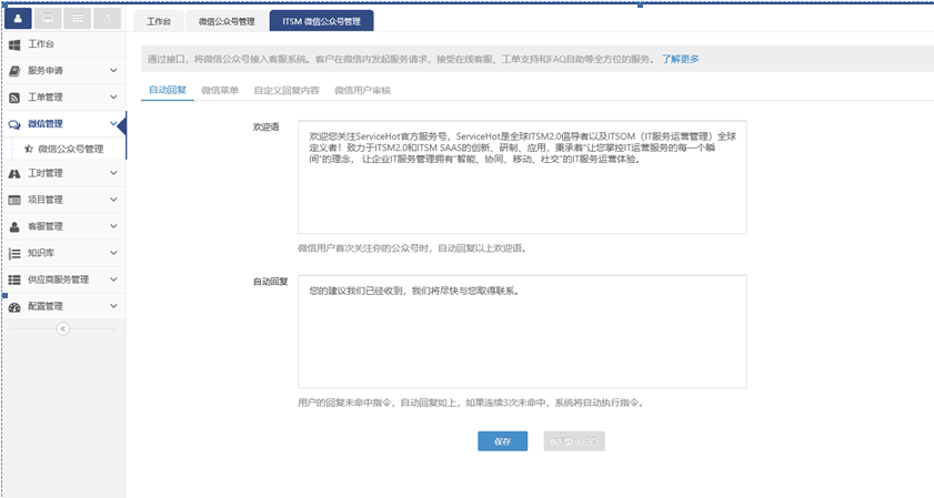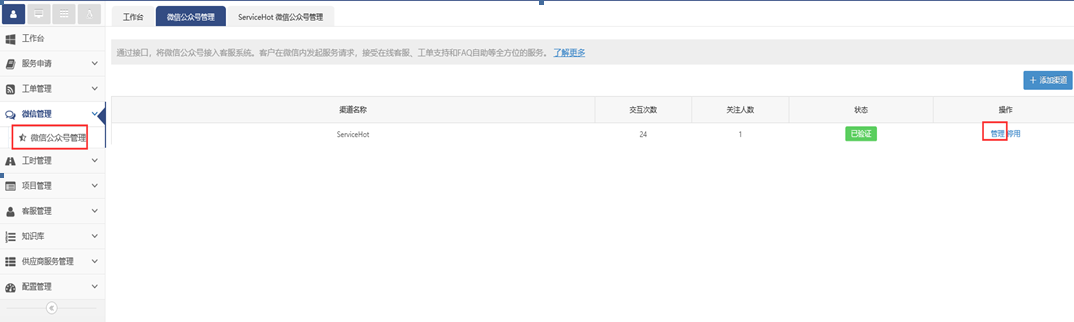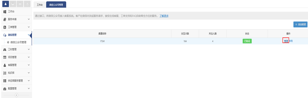 登錄到ServiceHot ITSOM服務(wù)管理系統(tǒng),點擊頁面導(dǎo)航欄中的微信管理—微信公眾號管理,打開微信公眾號管理頁面,如下圖
