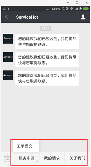 輸入相應(yīng)的公眾號點擊【+】按鈕,再點擊【關(guān)注】按鈕,完成微信公眾號的關(guān)注,以后用戶就可以通過微信的方式實現(xiàn)客服工單的提交和處理操作