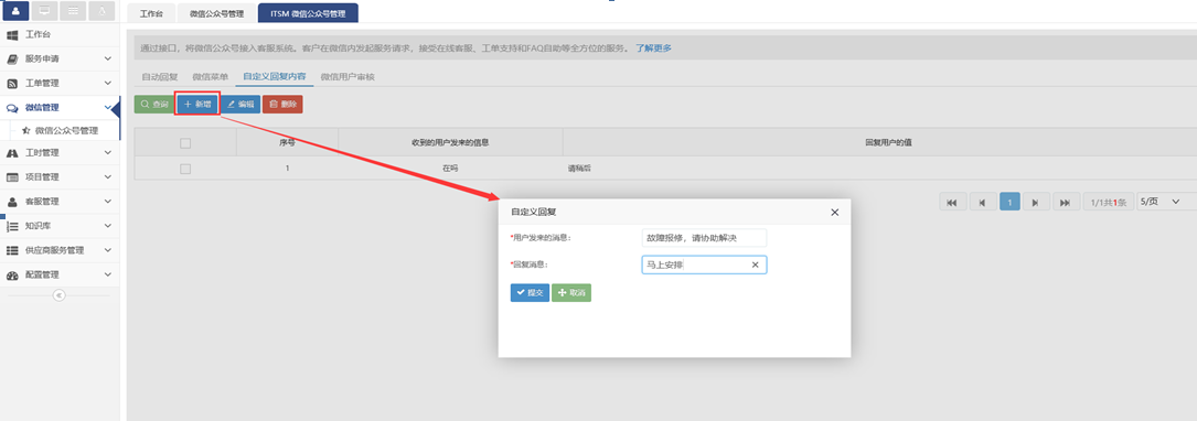 點擊下圖中的【新增】按鈕,彈出自定義回復(fù)對話框,設(shè)置用戶發(fā)來的消息及回復(fù)消息,點擊【提交】按鈕,撤回點擊【取消】,如下圖: