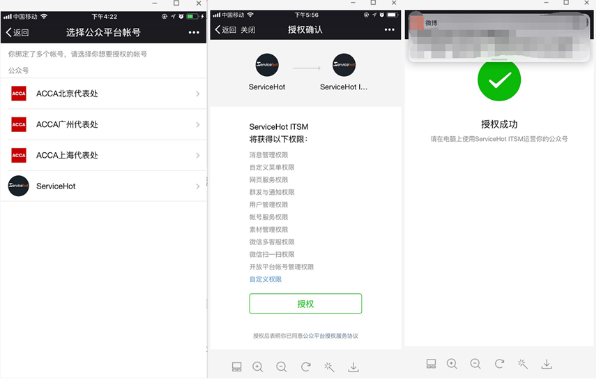 選擇你要授權(quán)的公眾號,點擊打開授權(quán)頁面,點擊【授權(quán)】按鈕,提示授權(quán)成功