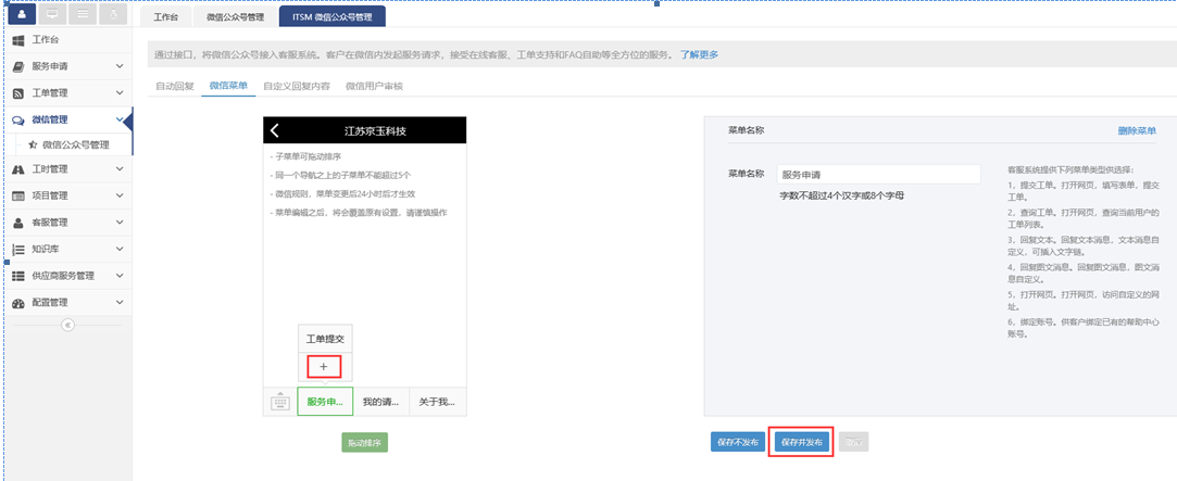 點擊上圖中的【+】按鈕,添加需要的微信菜單,添加完成后,可以點擊【拖動排序】按鈕對微信菜單進行拖動排序;如果需要發(fā)布,點擊【保存并發(fā)布】按鈕,可以在手機微信端看到相關(guān)的菜單信息,如下圖