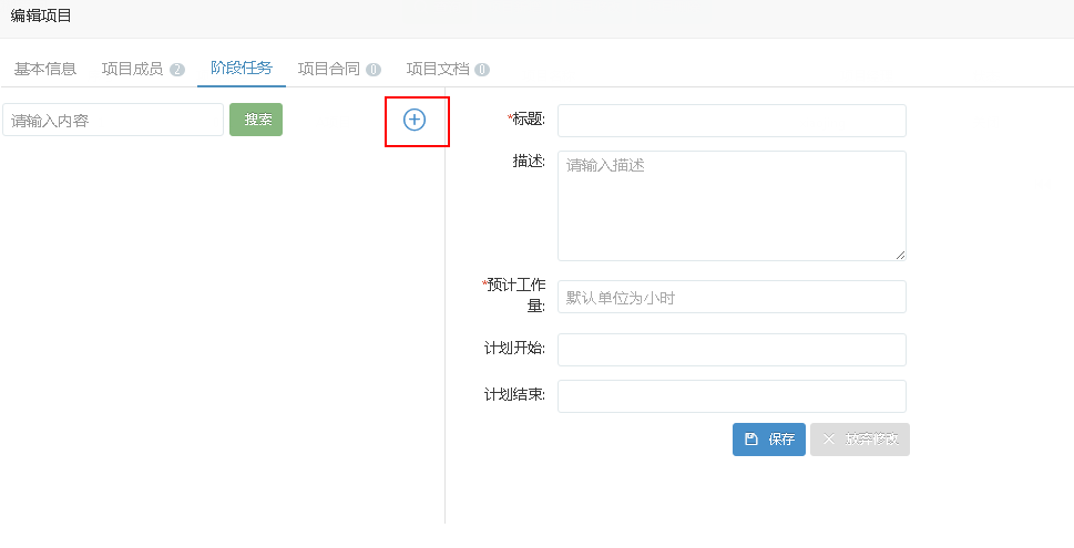 點擊【+】,右側(cè)進(jìn)入任務(wù)信息錄入界面。填寫標(biāo)題和預(yù)計工作量,其他非必填項選填,點擊保存