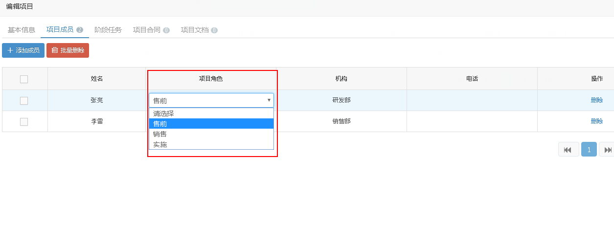 添加成功后,可以選擇成員的項目角色。該界面依舊支持成員刪除和成員批量刪除功能