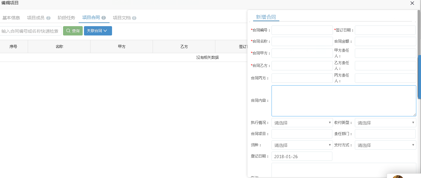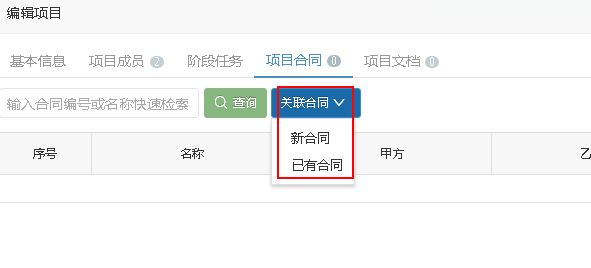 點擊關(guān)聯(lián)合同的下拉框,可以選擇關(guān)聯(lián) 新合同和已有合同。新合同即合同管理中的新增合同流程;已有合同可以直接選擇進(jìn)行關(guān)聯(lián)