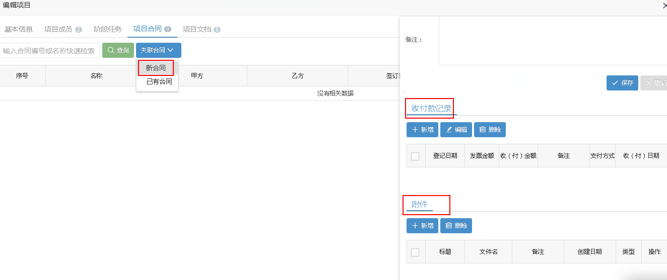 合同保存之后可以進(jìn)行收付記錄和附件的新增