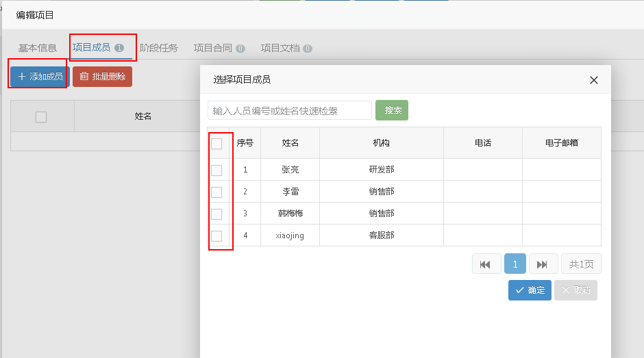 點擊添加成員。彈出對話框后選擇項目所需人員,點擊保存