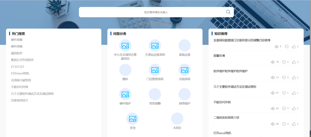 用戶知識(shí)庫(kù)分為三大模塊(熱門搜索、問(wèn)題分類、知識(shí)推薦),系統(tǒng)智能的為用戶呈現(xiàn)感興趣的知識(shí)和解決方案。管理員可以挑選重要的知識(shí)目錄,配置呈現(xiàn)在自助服務(wù)門戶首頁(yè),方便用戶查詢;