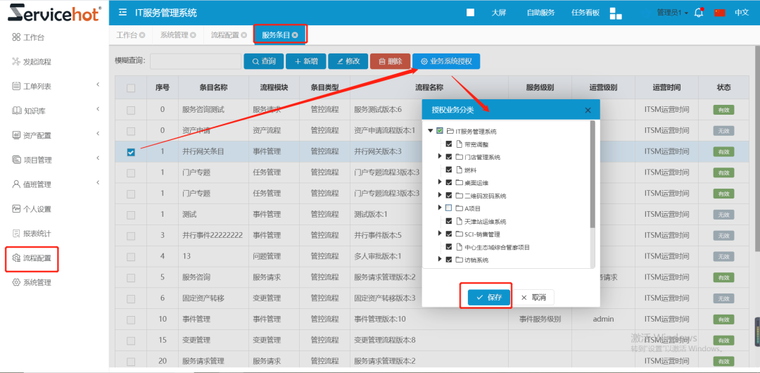 管理員可通過(guò)流程配置-服務(wù)條目對(duì)不同的業(yè)務(wù)系統(tǒng)進(jìn)行授權(quán)