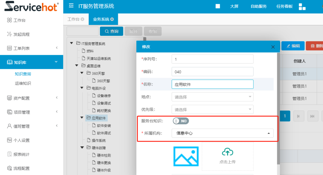 Servicehot ITSM提供復(fù)雜的業(yè)務(wù)分類管理功能,為滿足多組織機(jī)構(gòu)和多業(yè)務(wù)系統(tǒng)分類的使用場(chǎng)景,避免每個(gè)用戶提報(bào)問(wèn)題時(shí)都可以看到全部的業(yè)務(wù)分類,特增加流程與業(yè)務(wù)系統(tǒng)的關(guān)聯(lián)邏輯。比如,分公司一的用戶發(fā)起服務(wù)請(qǐng)求流程,只需要呈現(xiàn)分公司一的業(yè)務(wù)類型。