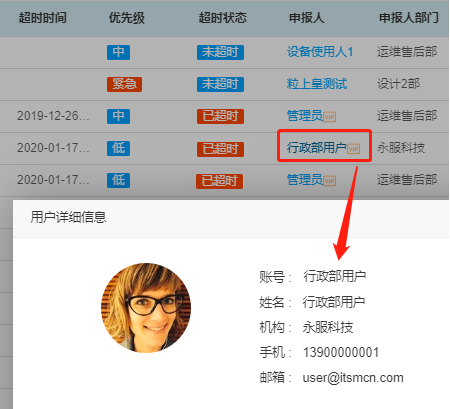 工單列表中,對(duì)VIP用戶進(jìn)行標(biāo)識(shí),方便工程師優(yōu)先處理VIP用戶工單。并且通過(guò)點(diǎn)擊申報(bào)人姓名,可快速查詢用戶更多信息。