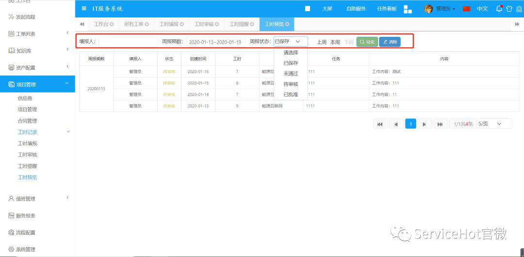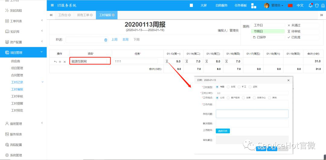 工時(shí)填報(bào)功能,用于項(xiàng)目資源分配和成果管控。ServiceHot ITSM本期對(duì)工時(shí)功能做了較多的優(yōu)化。