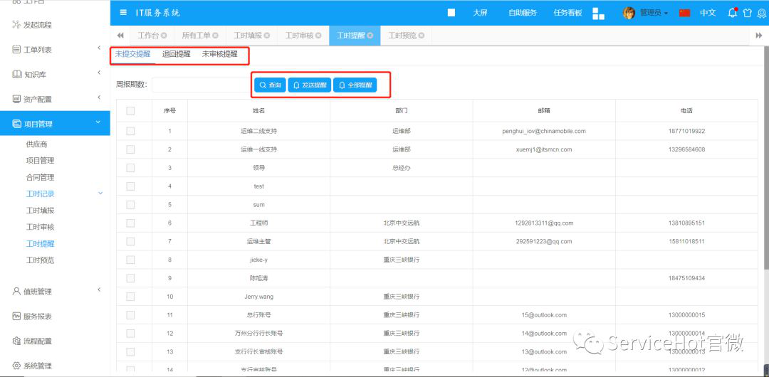 工程師可填寫(xiě)項(xiàng)目或者運(yùn)維工作每周工作計(jì)劃與實(shí)際發(fā)生工時(shí),并提交主管審批。主管定期復(fù)核各個(gè)工程師提交的工時(shí),最終可通過(guò)周報(bào)月報(bào)統(tǒng)計(jì)出各工程師的項(xiàng)目工時(shí)報(bào)表。若工程師未及時(shí)提交工時(shí),主管可通過(guò)工時(shí)提醒功能向工程師發(fā)出通知。