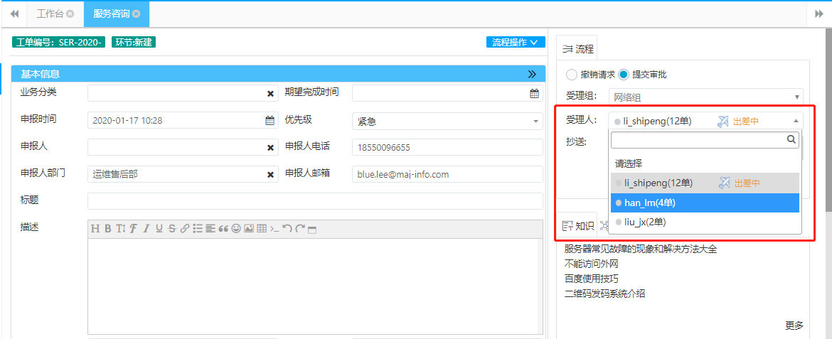 用戶提交或者服務(wù)臺(tái)轉(zhuǎn)派工單時(shí),系統(tǒng)自動(dòng)顯示工程師待辦工單數(shù)量,降低任務(wù)過(guò)重導(dǎo)致工程師不能及時(shí)處理工單的情況。并且工程師可標(biāo)記自己的狀態(tài),比如出差、正常上班、會(huì)議中等。