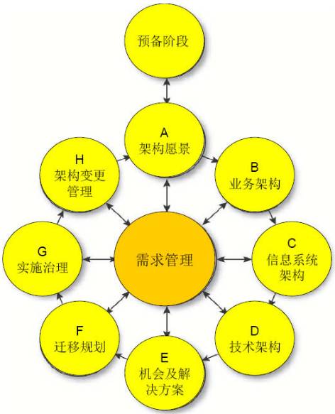 TOGAF是The Open Group Architecture Forum的簡寫,其本質(zhì)是一個行業(yè)標準的體系架構(gòu)框架。比較核心的是這幅圖,TOGAF的架構(gòu)開發(fā)方法ADM。