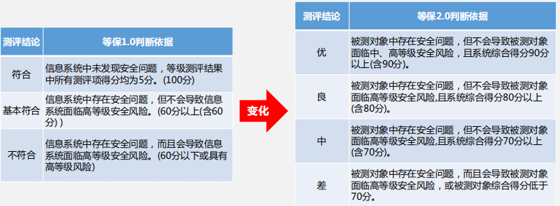 2.等保2.0測評結(jié)論:優(yōu)、良、中、差(四個等級)。其中測評結(jié)論“差”的判別依據(jù)是被測對象中存在安全問題,而且會導(dǎo)致被測對象面臨高等級安全風(fēng)險,或被測對象綜合得分低于70分。