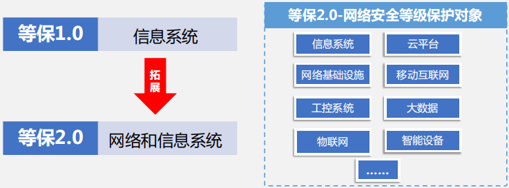 等保2.0覆蓋范圍更廣。等保2.0標準在1.0標準的基礎(chǔ)上,注重全方位主動防御、安全可信、動態(tài)感知和全面審計,實現(xiàn)了對傳統(tǒng)信息系統(tǒng)、基礎(chǔ)信息網(wǎng)絡(luò)、云計算、大數(shù)據(jù)、物聯(lián)網(wǎng)、移動互聯(lián)和工業(yè)控制信息系統(tǒng)等保護對象的全覆蓋。