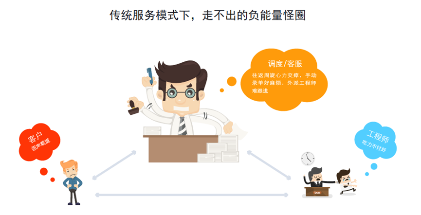 3、外派人員、現(xiàn)場服務(wù)人員難管理,服務(wù)管理成本增高卻不透明;
